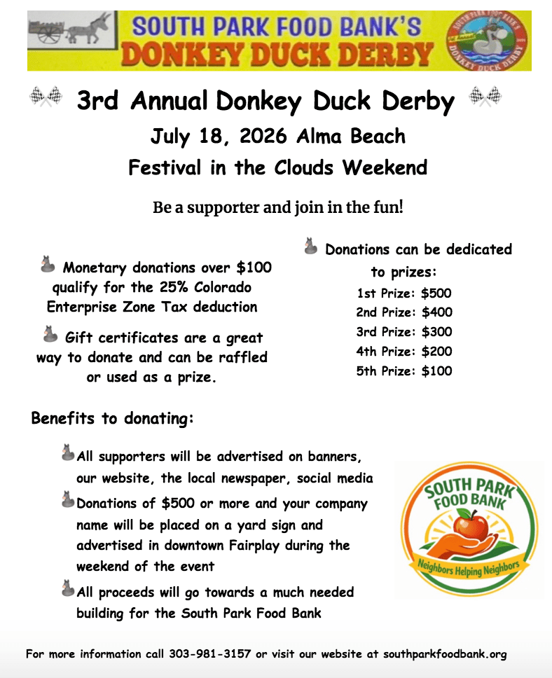 The South Park Food Bank exists to serve our neighbors in need in the South Park Area (Jefferson, Como, Fairplay, Alma, and Hartsel). We have one monthly distribution day, usually the second Saturday of the month. We are also available to help people in emergency situations.