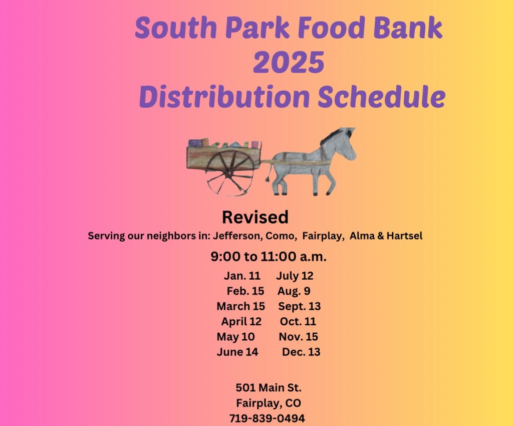 The South Park Food Bank exists to serve our neighbors in need in the South Park Area (Jefferson, Como, Fairplay, Alma, and Hartsel). We have one monthly distribution day, usually the second Saturday of the month. We are also available to help people in emergency situations.